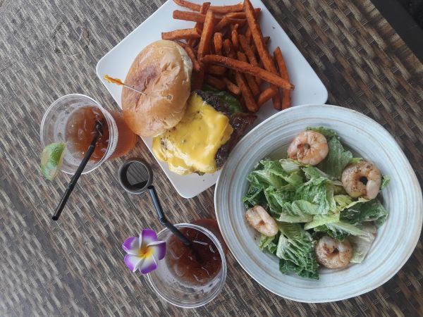 伊容--關島海灘酒吧&燒烤評論分享 The Beach Bar&Grill位於樂天飯店後面,我們是去吃午餐點了蝦仁沙拉、牛排漢堡餐、冰淇淋甜點、烏龍茶飲料味道上都OK 只是這家服務費是15%喔~~~ 建議大家可以在昏黃傍晚時去那喝上飲料看看夕陽跟海邊 這感覺一定會很棒很美的