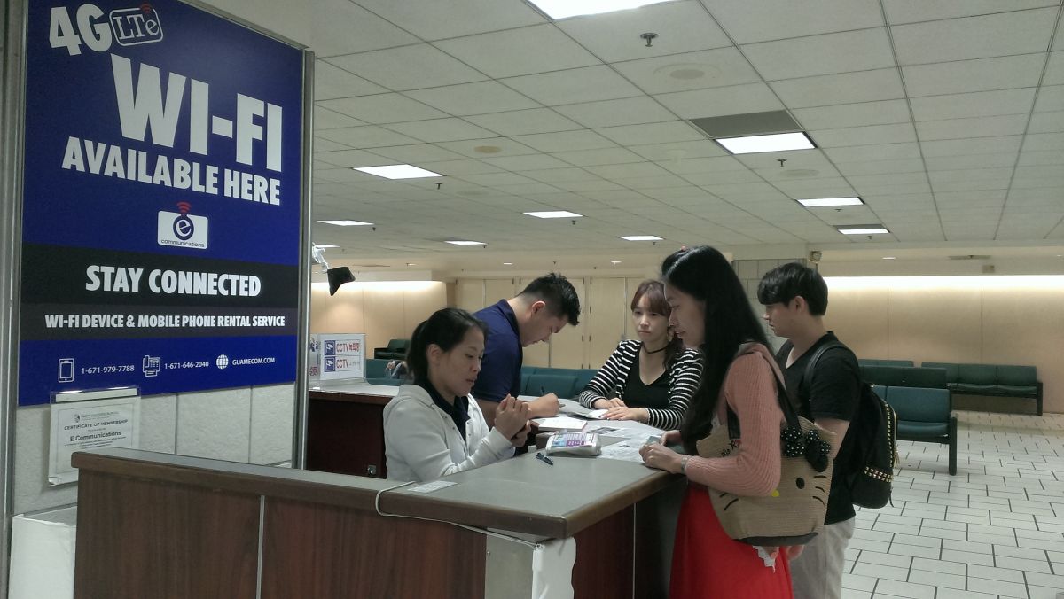 很方便的可以在台灣先預訂好分享器,到了關島一出關出來右手邊就是wifi的租借櫃台,櫃檯小姐會說中文,所以不用怕聽不懂~~~我們很順利的租借成功。剛好這次來關島遇到颱風,還好wifi使用上都很順暢,還可以分享給好幾個人一起使用~