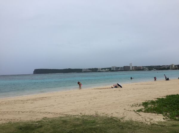 杜夢灣非常乾淨,非常著名的就是美麗的白沙,水清澈見底,海面也相當平靜,即使帶小朋友來都很安全,海邊有很多人在玩水,玩沙、浮淺,看大家都好悠閒,心情不知不覺也會跟著放鬆,我們去的時候正好是雨季,雨季的關島天氣實在是很詭譎多變,前一秒大太陽,下一秒突然看見烏雲飄過,越來越黑,越來越靠近就下起大雨,但一下子就停了,在關島根本沒有人在拿傘的喔!