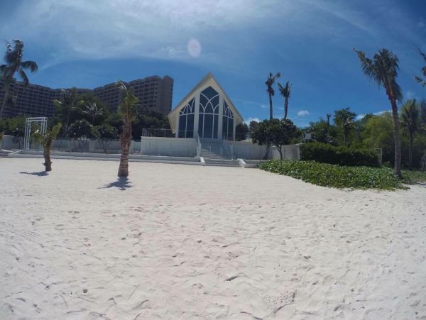 走在杜夢灣的海灘上(往日航飯店方向走去)一定會經過君悅飯店(HYATT REGENCY)旁的「璀璨鑽石教堂」,藍白色的教堂配上白色沙灘,好美喔!拍照這天教堂沒有開放,沒辦法看到舉辦婚禮的場景,有點可惜。