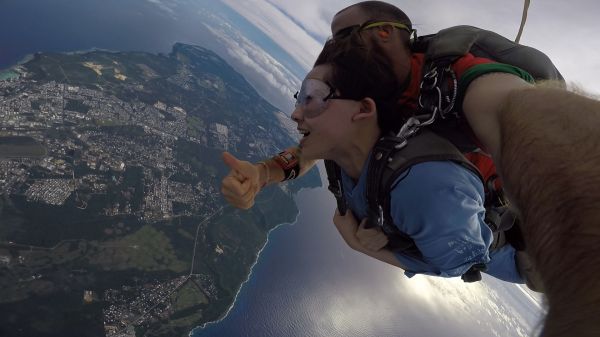 跳傘後自由落體的時間只有20~60秒,請強迫自己張開眼睛,多看看四周以及下方的景色,運氣好還能看到日出或是彩虹,如果一直閉眼睛實在是很浪費! 開傘後盡量看四周,往下看的話會很容易暈,據說還有人吐了。如果想自己控制傘的方向,可以在出發前跟教練說,有的教練會讓遊客體驗一下操縱傘的感覺。