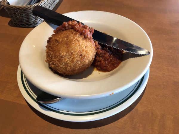 到卡布里喬莎記得要攜帶戀人岬的門票,因為門票的背面有一張Rice Croquette的免費招待券,點餐時記得交給服務生哦!我們只有兩個人,所以只點了一份玉米濃湯及一份墨魚麵,結果沒想到吃完免費招待的Rice Croquette及玉米濃湯後就已經七分飽了, Rice Croquette滿大顆的,它的茄汁肉醬很好吃,玉米濃湯的份量也不小,一人得喝兩碗才喝得完,然後墨魚麵的份量真的很驚人,可能要四五個人才吃得完!麵雖然不錯吃,但吃多還是會有點膩喔!