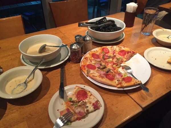 點了墨魚麵、玉米濃湯和Pizza,份量真的是非常驚人,雖然之前爬過文了,但我們還是經不起其他餐點的誘惑,結果下場就是吃不完,哈哈