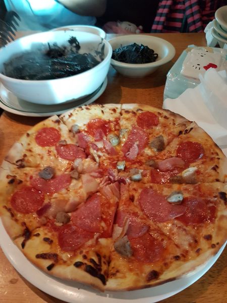 抵達關島的第一餐,我們選擇了徒步可及的Capricciosa,兩大一小點了一份馳名的墨魚麵跟一個超級總匯pizza, 結果份量多到pizza幾乎整份外帶。Pizza麵皮薄脆,用料也很多,而墨魚麵更是香氣濃郁,小卷熟度也處理的很剛好,不只老公連吃好幾碗,連女兒也吃的津津有味,旅程第四天晚上還吵著再去吃了一次!