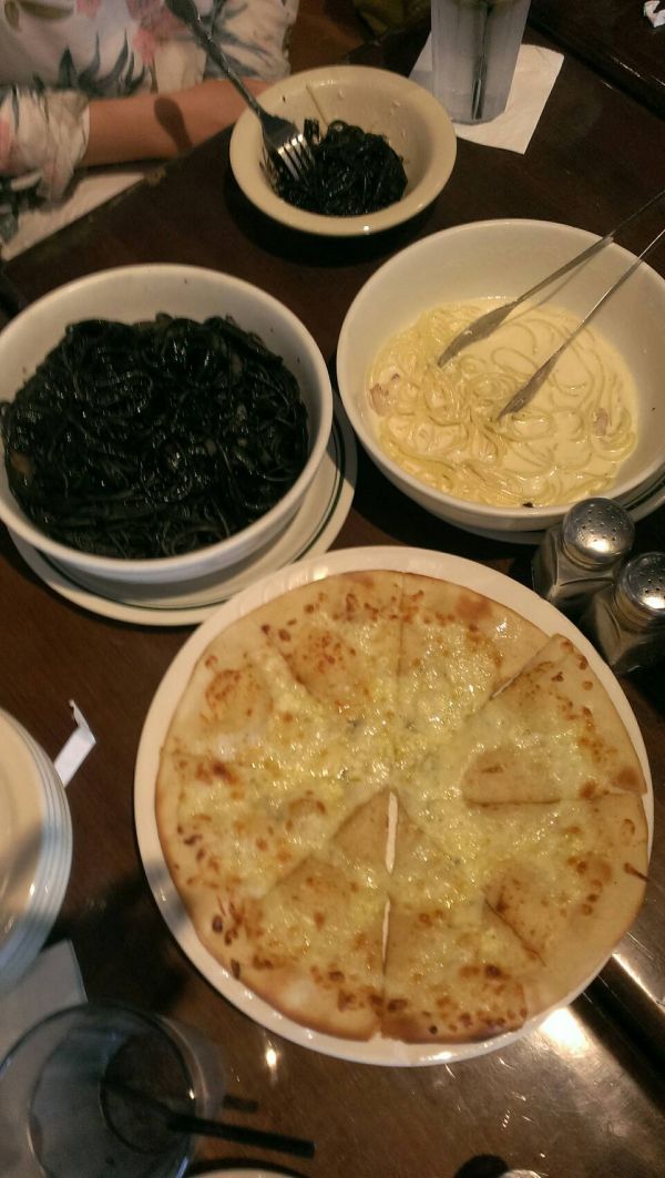 卡布里喬莎在台灣也有分店我們雖然也有用餐過,但真的沒什麼值得我們驚艷的地方,可是看到關島的墨魚麵太多人推薦(剛好又是我最愛的墨魚口味),覺得那一定要來品嚐品嚐!! 我們點了店內招牌菜有卡布里喬莎主廚披薩(Pizza Capricciosa)與又黑又香的墨魚麵(Squid Ink Spaghetti)..... 本來一上桌看到這麼一大碗公想說:慘了~哪吃的完?!>"< 最想不到的是好吃到我們兩個人還是把它KO了,當然比薩真的塞不下全部,只好剩餘的一半打包回飯店當消夜吃了~呵呵