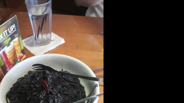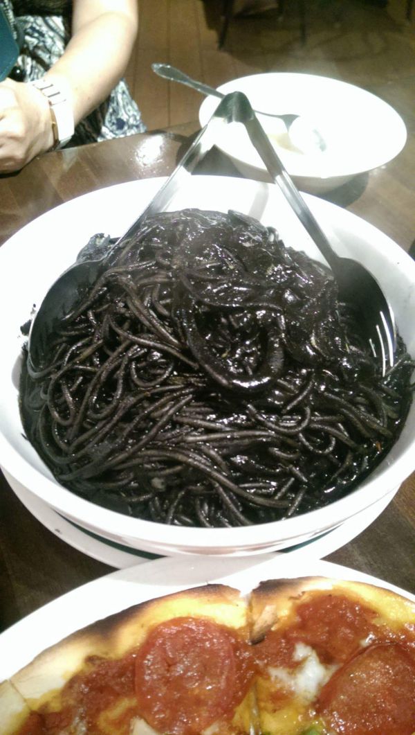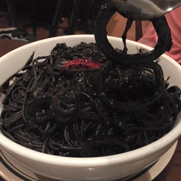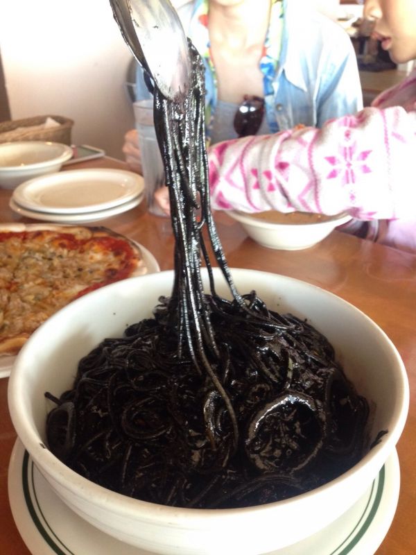 周遭朋友一知道要到關島旅遊,就每天不停的提醒一定要吃有名的墨魚麵,上網google墨魚麵的照片後,心裡覺得有甚麼稀奇的,不過就是一團黑黑的義大利麵,抱著這樣的心情到了餐廳,當看到墨魚麵本尊時,首先是驚訝於它的巨無霸size,放入口中,墨魚的鮮甜滋味瞬間充滿整個口腔,品嚐後,不忘留下巫婆般的照片(吃過的人一定明白我說的樣子)