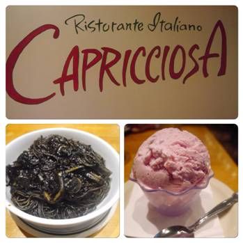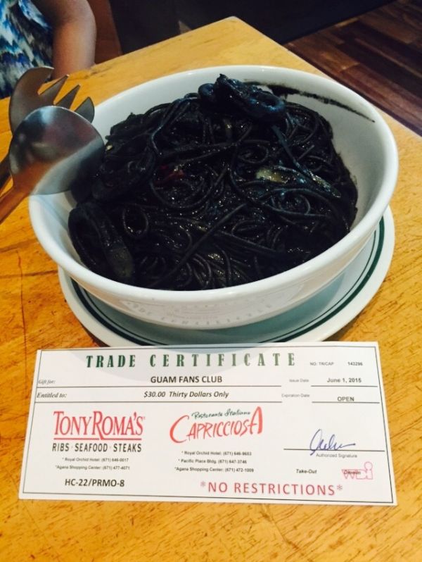Capricciosa在關島好像有三間,很幸運的是其中一家就位居我們下榻的悅泰飯店斜對面(皇家蘭花飯店二樓),走路過去不用五分鐘,進到餐廳裡面,真的滿滿都是客人!我們點了經典的墨魚麵,麵條Q彈,花枝很嫩很新鮮,吃了一口滿嘴黑,小孩也樂開懷!
