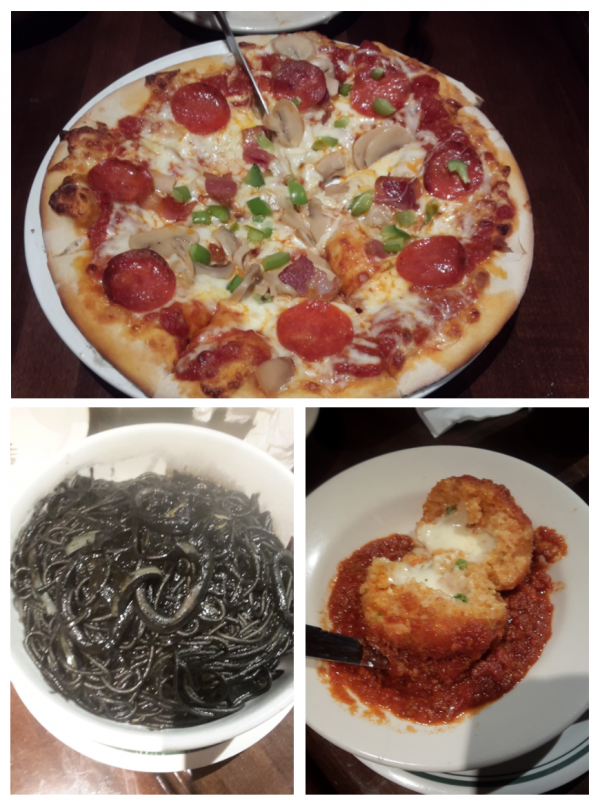 出發前就看到很多網友大推capricciosa的主廚披薩及墨魚麵,很幸運的是這家餐廳就在我們下榻的悅泰飯店斜對面,走路不到五分鐘便可抵達。聽說份量都很多,但因為都想嚐試,所以還是點了披薩跟墨魚麵,還有憑戀人岬票根送的起司飯糰,當墨魚麵上桌時真的是出乎意料的大大大!這根本是四個大人都吃不完的份量吧!第一次嚐試墨魚麵吃得滿嘴黑黑,真的是奇特的經驗,當然口味果然沒讓人失望,是好吃的!
