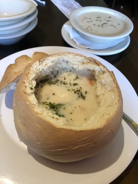 大推麵包湯和墨魚麵,分量很多,建議四人點兩人份的餐就好,因為不知道分量,我們不小心點太多,soft drink可以無限續杯,店員服務態度也很好。口味和台灣的不一樣,會為了麵包湯二訪。