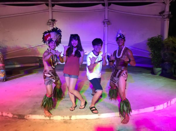 晚餐表演秀部分,一開始是人聲唱歌與樂器表演,再來樂器與人聲轉變成配樂,緊接而來的是舞蹈秀表演,穿著特色服裝、跟著音樂舞蹈身體,遊客的目光都由食物轉到了表演者身上,舞蹈表演後,也加入了火舞表演,此時氣氛嗨到最高點喔!後面舞者也與遊客親切的互動,感受到關島人的熱情;不過餐點部分我個人是覺得可能比較還好,是在裡面取食材,無限自助吃到飽,把食材拿到戶外烤,有牛、雞、魚、海鮮、一些甜點等等,食材不算多樣,食物不夠好吃,但至少飲料酒類可以喝到飽,食物好吃度部分別太要求的話,就是還不錯的活動喔!