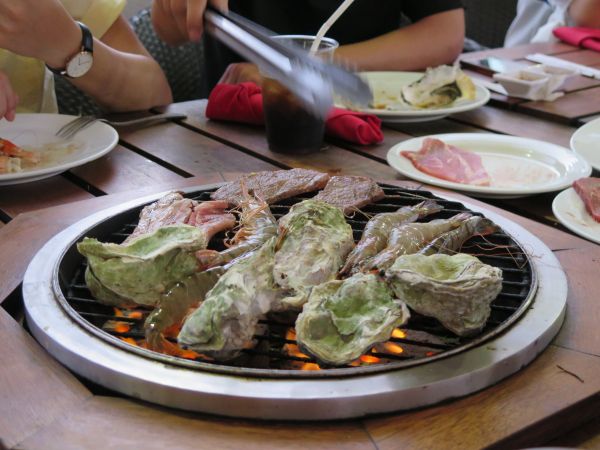 在關島體驗一邊看秀、一邊大口吃肉與喝酒,吃到飽的”悅泰BBQ晚餐”絕對是肉食族的好選擇,晚餐約六點就坐取餐燒烤,肉品的部份有牛肉、豬肉與雞肉,海鮮則有大顆生蠔、鮮蝦與魚,種類相較之下確實不多,但份量上誠意十足,嗯…讓我們來互相傷害吧!