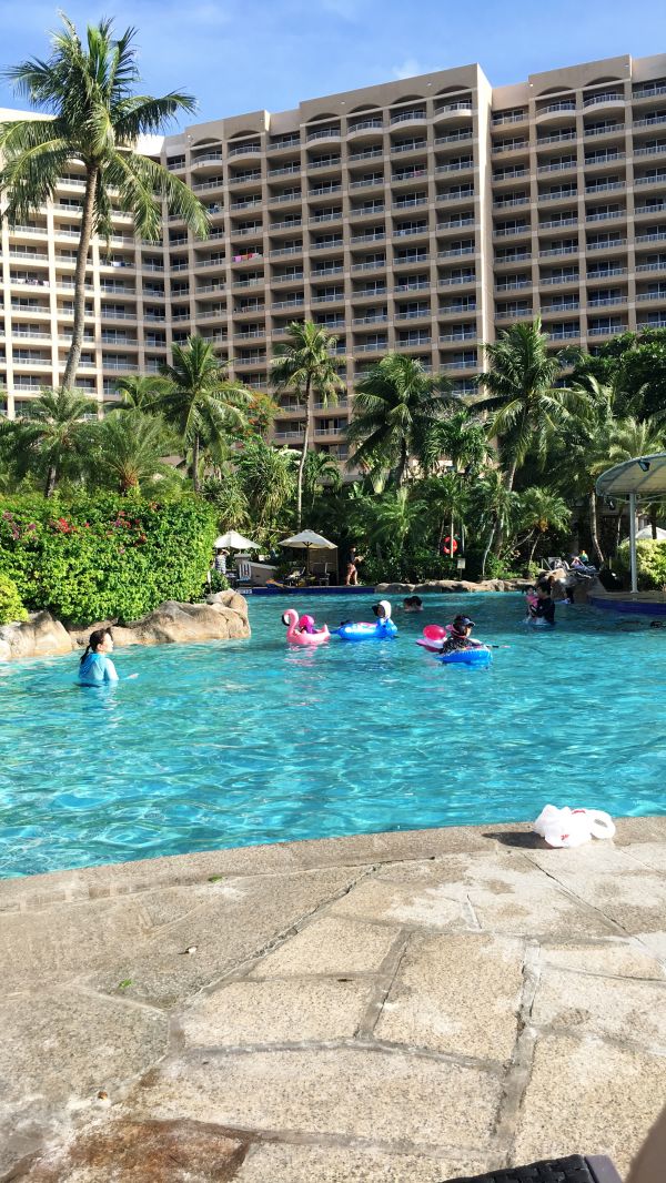 關島的泳池屬於開放空間,這次因為婚禮合約規定,必須有一晚入住教堂指定飯店,我們很想玩凱悅泳池,於是訂了2晚,但帶了大型泳圈,最後也只玩了泳池一下下,沒玩滑水道就衝到海邊去。