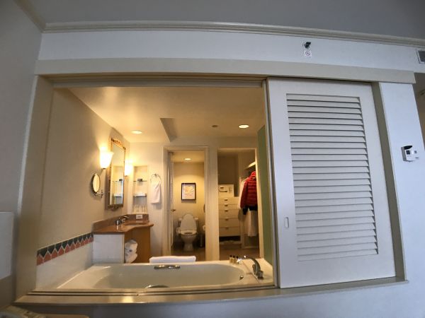 可以將百葉拉開,把浴室跟臥室連通一起,讓視覺拉長距離,這樣的房間我還挺喜歡的。廁所是免治馬桶,且與浴室分開,所以可以一個人洗澡,一個人上廁所,設計理念好棒。推薦大家來住唷!