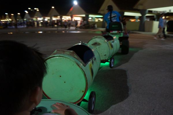 歷經一下午的環島行程,晚上抵達了查莫洛夜市,這邊的夜市不像台灣的夜市都是攤販,而是一間一間的開放式磚房,但同樣的是具有濃濃的人情味,而且還有一個交誼廳讓遊客與當地人可以一起跳舞唱歌交流。首先,當然要來吃有名的BBQ便當,幾串牛雞串燒搭配玉米等的配菜,加上好吃的紅豆飯,一個便當才約10美金,相當超值。另外,我們也買了椰子汁作為飲料,然後也品嘗了椰子刺身,真的很像在吃生魚片喔!最後,也讓我兒子坐上用鐵桶做成的小火車在夜市內周遊,相當有趣喔!!