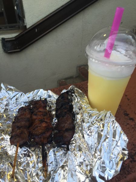 查莫洛夜市是關島當地的唯一夜市且只有星期三才有,營業時間也不長(17:00-20:30),晃了ㄧ下看到kris烤肉攤,前面已經有排隊人群,在排隊過程中,試喝了芒果揶奶,哇!好喝耶,立馬去買,雞豬ㄧ串1.5美金,牛一串3美金,吃完心得雞肉串還不賴