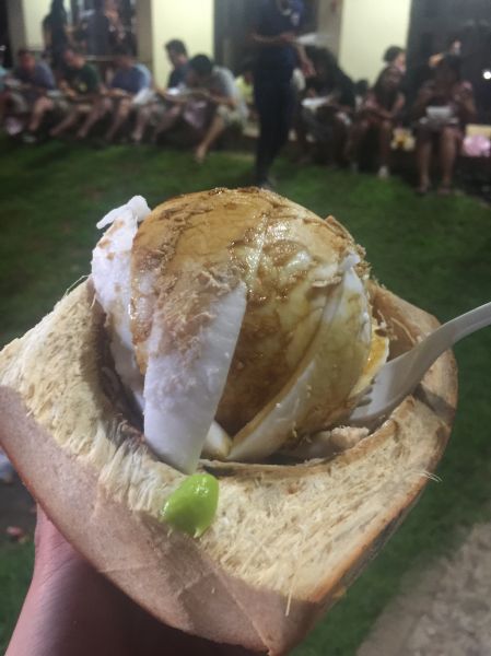 這裡的夜市比較不像台灣什麼好吃的都有 比較多的還是烤肉,大隻的烤腿。 還有一個特別的就是Coconut Sashimi,椰子水喝乾之後拿回去給店家,幫你把椰子肉刮下來,加一點wasabi,還有醬油(台灣的龜甲萬),意外的好吃。 不過可能要碰點運氣,有的椰子肉刮下來異常的硬,整個就是沒有辦法入口,我們三個人的椰子,有兩個人的就是硬到不行,直接丟垃圾桶。不知道有沒有辦法找老闆換一個?(椰子$5+沙西米$1) 飲料我們喝了奶昔,其實就是加了點糖水跟調味的東西,然後再將冰塊用機器打碎再加一點不知道是不是牛奶的東西,一杯$5,非常普通。