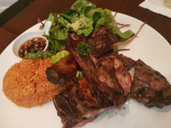 杜夢灣店就在怡寶沙灘入口處,從希爾頓沿著沙灘散步就到了,是在下午2點的時候到達,不需等候。 這次是點綜合版的查莫洛燒烤,有滿滿的牛小排、豬肋排、雞腿排,還不錯,但跟Meskla Bistro比還是略遜一籌;驚豔的是帆船餐廳的紅米red rice,是在關島吃到最好吃的。老婆點的是主廚推薦三明治,我們沒有很愛。