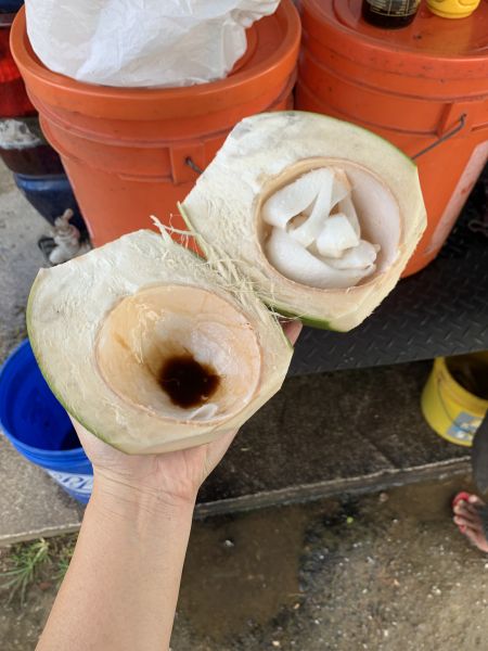 去了二次聖母瑪莉亞教堂,都沒機會進入教堂內觀賞,所以在外拍照;教堂旁有一台小貨車再賣椰子汁(5美元),冰涼又好喝,喝完後再把椰子交回給老闆,老闆會切開,把椰子肉挖起來,切條狀,沾哇莎米,當成莎西米這樣吃。別有一番風味。