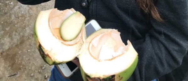 一走上去可以隱約感受到教堂的寧靜,我們去的時間下雨沒辦法等到敲鐘,雖然無法入內參觀但外頭透明玻璃看進去真的會感受到基督教的氣氛,外頭看進去真的很美很純淨。旁邊有一台小貨車有賣椰子水,椰子水很甘甜,喝完的椰子水拿給他頗開可以吃裡面果肉配哇沙米跟醬油,不敢加醬料的也可以不加喲!有去到那邊的一定要喝喝看它們當地的椰子水喲!