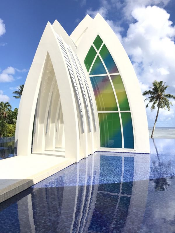 『彩虹教堂』 彩虹教堂位於PIC裡頭,網球場後面,非相關或參與婚禮人員不可入內參觀,不過在外頭拍了些美麗照片,入口落地窗呈現美麗彩虹顏色,四周水池環繞,也是關島結婚熱門排行地點前三名喔。