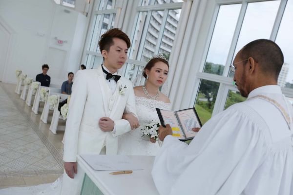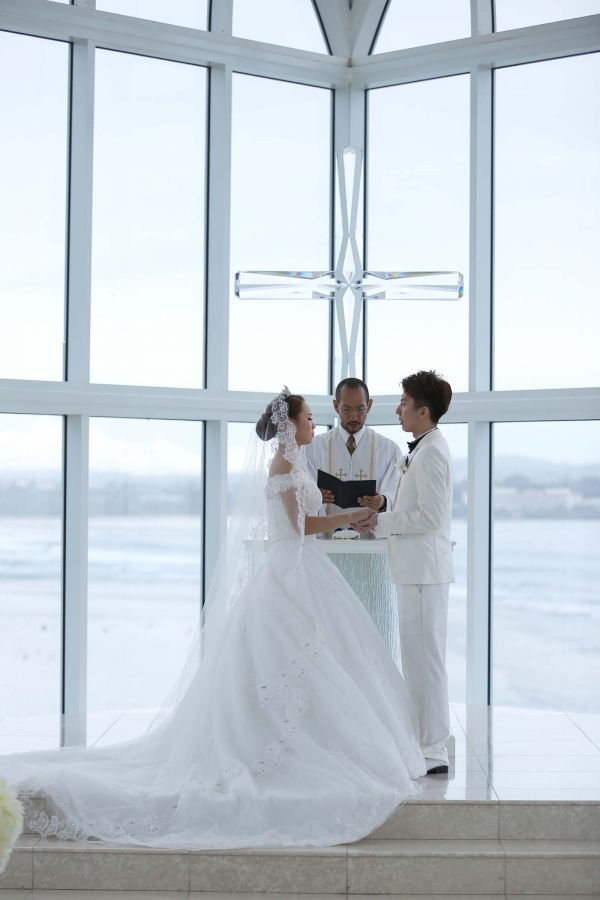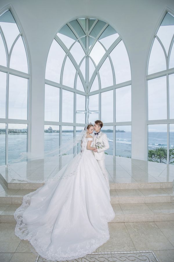 來到關島日航水晶教堂舉行證婚儀式,真的像作夢一樣,從化妝到證婚過程到沙灘及教堂週邊拍攝,公主般的禮遇,讓我備感幸福。關島日航飯店在杜夢灣的北邊,日航水晶教堂豎立在那整個很有氣勢,教堂周圍有新郎新娘休息室和棚內拍攝場景,今年1月份水晶教堂與週邊剛整修完畢,濃濃歐風感加上明亮美麗的環境,讓我們拍了不少美照!!!婚禮前一天來到婚顧公司開會確認明天流程,隔天上午一大早,工作人員迎接開始化妝,幫我化妝的是一位日本新秘,不用擔心語言不通,婚顧公司都有附上中文翻譯人員,有甚麼問題可以隨時反應。除了新秘、攝影師、還有幾位工作人員,大家都很專業的協助我們完成婚禮。雖然整個關島證婚之旅,唯獨這天天空不太作美,偶爾飄起小雨,但當證婚開始整個天空明亮起來,真的為我們開一道光的感覺!當教堂門打開的那一刻,我心裡的悸動與感動一湧而上,看到媽媽紅了眼眶,我的眼淚也不停掉下來,心裡無限感動覺得自己怎麼可以在這麼美的地方證婚。經過牧師的宣誓我們成為夫妻,我們永遠記得這麼幸福的一刻。