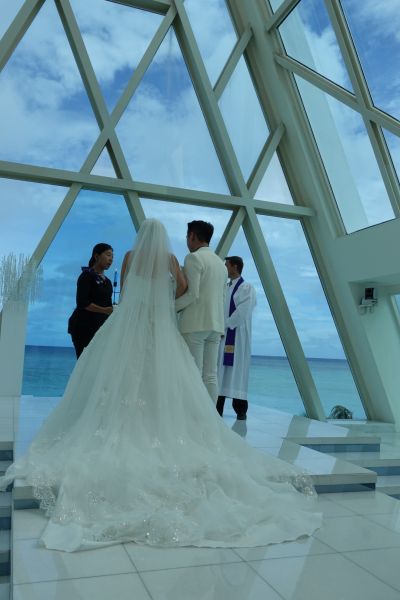 藍星教堂真的超級美的!從教堂裡面就可以看到外面藍色很美的海。教堂二樓是休息室,我們新郎和新娘會先去二樓等候開始。我最喜歡的部分是點蠟燭的部分,蠟燭配上教堂真的很美。教堂外面的白沙灘也是一個很好拍照的地點。