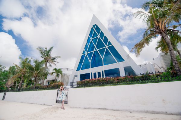 延著熱鬧繁華杜夢灣沙灘前往,會看到獨特希臘式金字塔造型的浪漫風格教堂- Blue Aster。Blue Aster希臘文中意思是「Blue Star」,在西式傳統婚禮中有「something old, something new and something blue」的涵義,因此Blue也有著幸運的涵意。 只可惜無法進去裡面參觀,但幸運的遇到新人在外面拍婚紗照,幸福浪漫指數整個飆高,站在遠處一起感受幸福的氛圍~