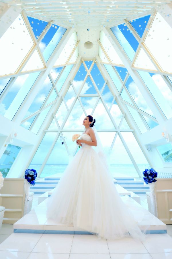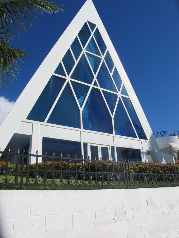 這是離悅泰飯店最近的教堂-幸福藍星教堂, 三角形的外觀,藍色的大片玻璃,佇立在白色沙灘上,讓它更顯得浪漫。 但很可惜無法進去裡面參觀,只好在外圍拍拍照留下美麗的回憶