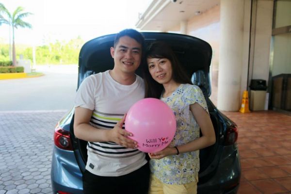 男孩跟女孩一同走到飯店門口,男孩請女孩打開後車廂,一顆又一顆寫著Would u marry me?氣球從後車廂紛紛飛了出來~車上傳來今天妳要嫁給我的輕快音樂,女孩紅了眼眶,男孩到了女孩面前也流下了眼淚,對著女孩說~同年同月同日生的我們,長跑了2千5百多天以來,終於決定可以一起步入禮堂,這幾天的秘密求婚籌備讓我們起了點小爭執,希望妳能原諒,這次是我帶妳一起出國的第五次,希望透過我的努力,能每年都帶著妳一起出國,妳願意嫁給我嗎?