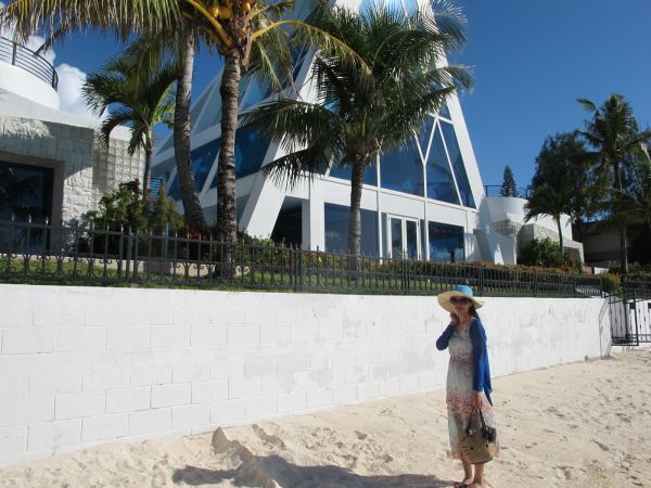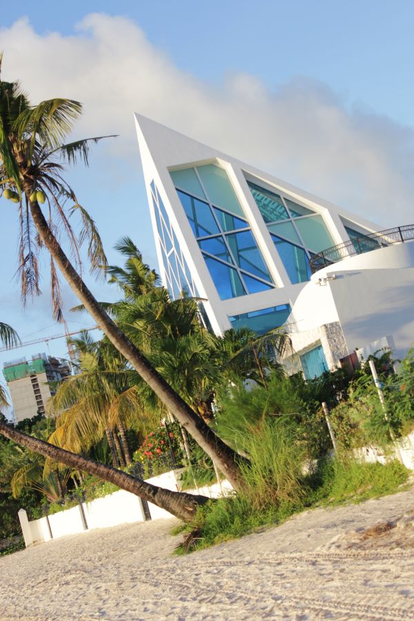 三角形的外觀,藍色的大片玻璃,佇立在白色沙灘上,讓它更顯得浪漫。