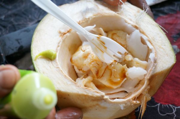 現場將椰子汁喝完後,交給老闆,老闆用俐落的刀法,將果肉挑出,最後淋上台灣製造的"龜甲萬醬油",這就是椰子肉生魚片,椰肉搭配上龜甲萬醬油,說不出的絕配好滋味,真的超級好吃的!!!