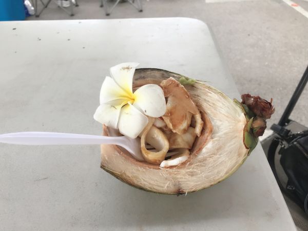 星期日特別起了一個大早就是要來感受一下關島特有的早市,很特別的是這裡一早一樣滿滿的燒烤當早餐,哈哈!買來一顆椰子喝完裡面的椰子水,老闆還幫你剖開把椰肉挖下當沙西米,嚐一口~哇!這口感真的很像在吃生魚片,有機會來一定要吃吃看!