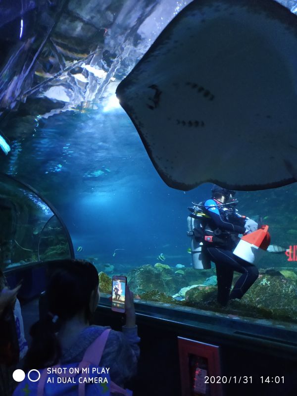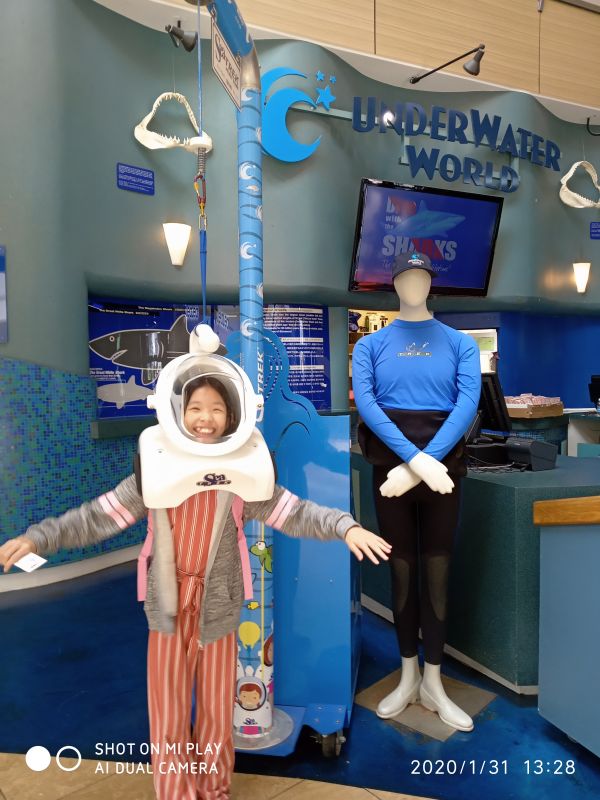 親子行程,當然要來一下水族館啦,吃完午餐,來看下午2:00的餵食秀(餵食秀只有日、三、五),小朋友可開心啦,我家十歲姊姊手機拍照錄影不間斷,一歲娃看得大呼小叫and滿場跑。另外也有特殊一點的可以戴頭盔進入水裡與魚兒共舞不過本次並沒有安排僅在門口拍個照過過癮;附近有很多免稅店,建議可以上午逛逛街,中午用完餐後來逛一下水族館喔!! ps:2歲以前的小娃不用門票