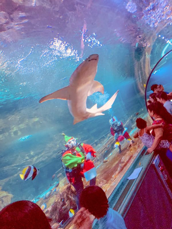 帶著小孩來到關島水族館,趕上下午兩點的餵食秀,因為聖誕節前夕,館內潛水員還特地穿上聖誕裝餵食,小孩看的目不轉睛,來水族館一定要安排餵食秀的時間來喔!