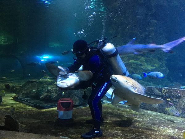 建議大家有安排這個景點一定要特別選『周一・三・日』的『下午兩點鐘』,因為潛水員在這三天會在水下餵食鯊魚,巨大的鯊魚、魟魚都會跑過來跟潛水員撒嬌討魚吃,潛水員也會把魚的身體翻來翻去、穿過跨下等等表演,還會跟客人隔著海底隧道的玻璃作互動,過程非常的有趣。水族館內還有各種水母、虱目魚、鰻…等不同生物的水族箱展覽,可以發呆好一陣子。